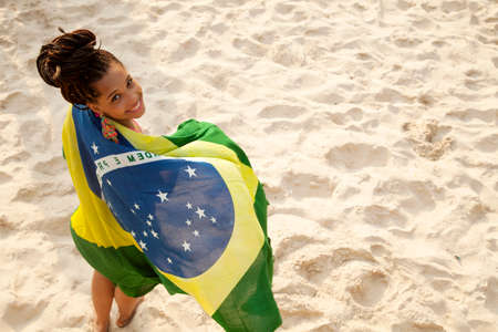 Overhead portrait of young woman wrapped in Brazilian flag, Ipanema beach, Rio De Janeiro, Brazil