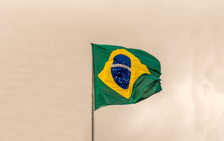 Brazil's flag. Flag fluttering in the wind. Symbol of the Brazilian homeland. Pavilion. National symbol. Cloudy blows. Rain clouds.