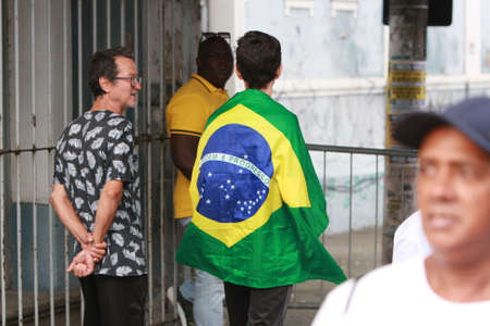 Salvador, Bahia, Brazil - October 22, 2022: Supporters of the President of Brazil Jair Bolsonaro, protest by placing a large Brazilian flag in Farol da Barra square in Salvador.