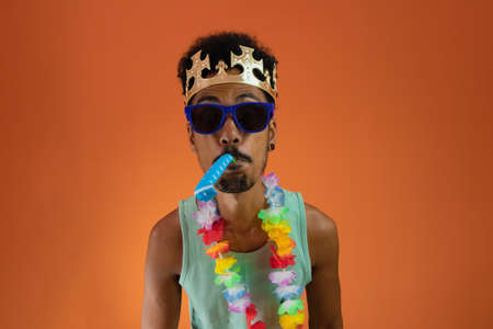 Black man in costume for brazil carnival isolated on orange background.