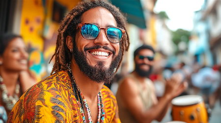 Man with a bright smile wearing sunglasses and a colorful shirt at a vibrant street festival with drummers and a joyful atmosphere.