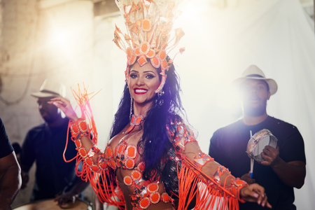 Samba elegance. Shot of a beautiful samba dancer performing in a carnival with her band.