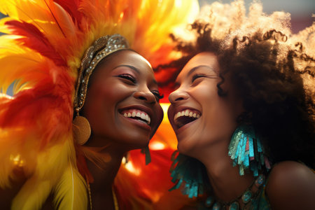 A group of vibrant, smiling women wearing colorful outfits and accessories enjoying a lively street parade scene filled with happiness and diversity.