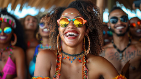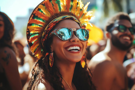 Happy woman wearing sunglasses and a colorful feather headdress, celebrating the vibrant atmosphere of Rio Carnival in Brazil