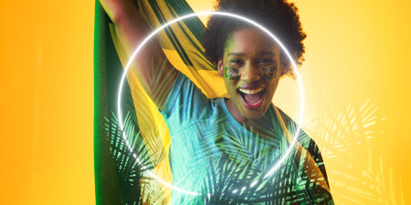 African american female fan with brazilian flag and face paint by illuminated plants and circle. Copy space, composite, sport, competition, soccer, shape, cheering, screaming, nature, patriotism.
