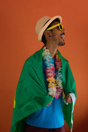 Man Celebrating Brazil Independence Day Next in Country Flag, Cinematic Sunset City Background