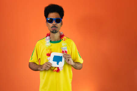 A joyful Black man wearing a yellow shirt with Brasil written on it, holding a Brazilian flag and cheering enthusiastically.