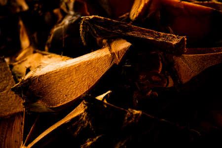 Banyan Tree Bark on the black wooden surface along with a single dried yellow colored leaf with it.Used mainly as an Immunity Booster.Horizontal shot.