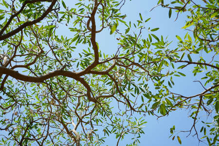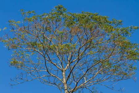 Spread branch of tropical treetop with sunlight beam (Terminalia ivoriensis A. Chev. in science name)