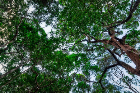 An upward view of tree canopy in the tropical forest, Sri Lanka, exotic adventure in Asia, green leaves, background, Upper Branches Of Tree With Fresh Green Foliage