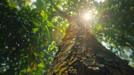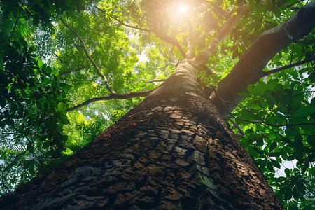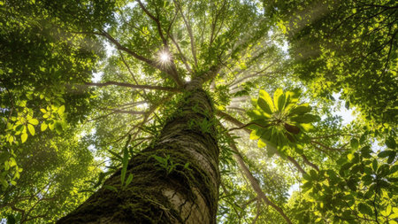 An upward perspective captures a tall tree ascending towards the sky. The image showcases intricate textures of bark and a canopy of vibrant green leaves. The composition is a vertical shot, with strong natural lighting. Suitable for environmental themes, editorial, and design projects.