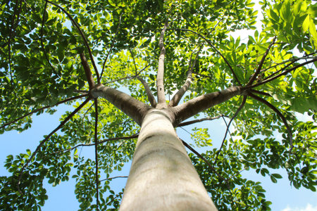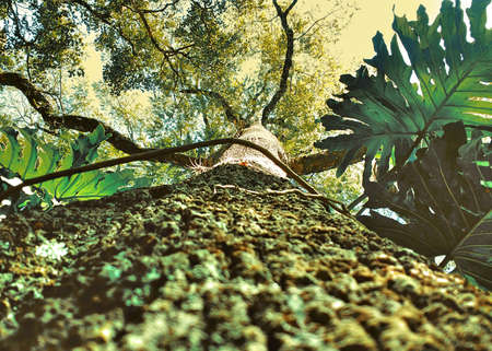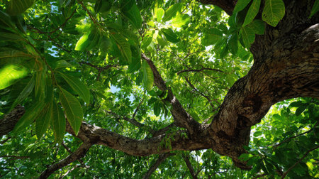 An upward perspective captures a large tree with dense, green leaves reaching towards the sky. The image showcases a textured tree trunk and branches that fill the frame. This natural composition, with overhead lighting, provides a visually appealing look suitable for various commercial or editorial applications.