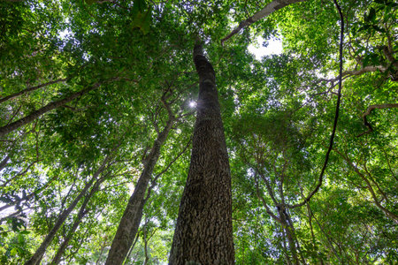 This captivating image captures sunlight streaming through lush green trees in a tropical forest, creating a serene and tranquil atmosphere filled with vibrant foliage.