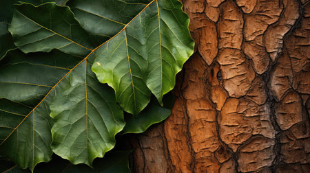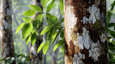 Explore the enchanting beauty of lush green leaves showcasing detailed textures against tree bark in a serene misty forest setting that invites tranquility.
