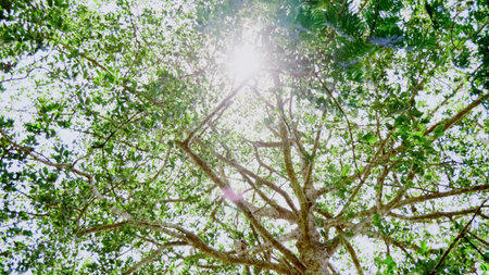 Looking Up Through Canopy: Forest Scenery and Sunlight Beaming Through Leaves