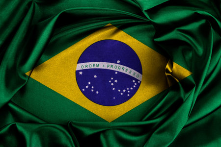 A detailed close-up of the Brazilian flag, showcasing its green, yellow, and blue colors with the national motto.