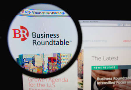 LISBON, PORTUGAL - FEBRUARY 6, 2014: Photo of Business Roundtable homepage on a monitor screen through a magnifying glass.