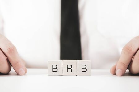 Side view image of BRB abbreviation spelled on white wooden blocks in front of sitting businessman