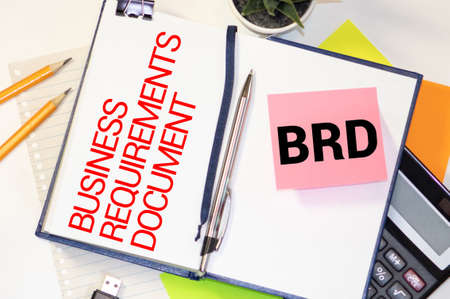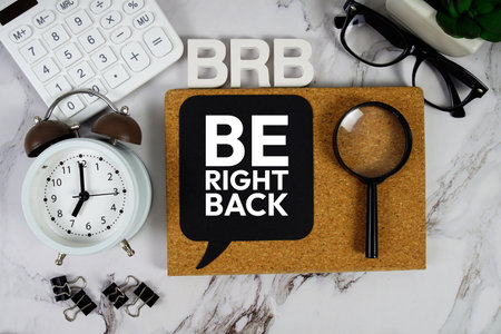 BRB - Be Right Back acronym with calculator, alarm clock and magnifying glass, Business concept