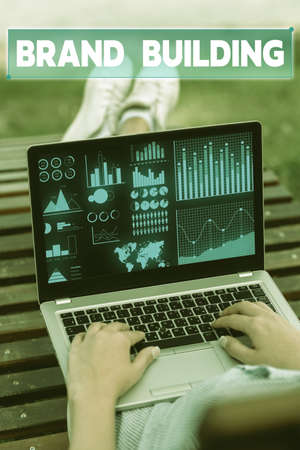 Text caption presenting Brand Building. Word Written on boosting customer s is knowledge over a certain business Laptop Resting On Lap Of Woman With Cross Leg Accomplishing Remote Job.