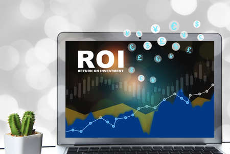 Return on investment ROI and growth graph with currency symbol on computer on desk on abstract background. Making money and saving concept and business stock trading idea