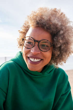 Portrait of a happy young mixed trace woman face with a curly afro, beautiful hispanic woman enjoying some time at the beach. Closeup shot of a smiling young female having fun on a weekend