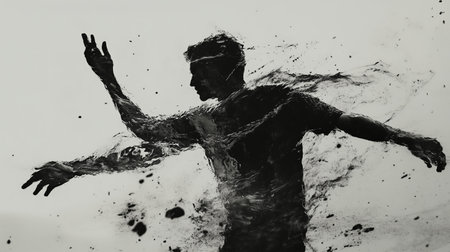Abstract silhouette of a person dancing amidst splashes of black ink against a light background in an artistic representation of movement
