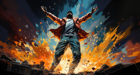 Young man jumping with colorful powder exploding behind him