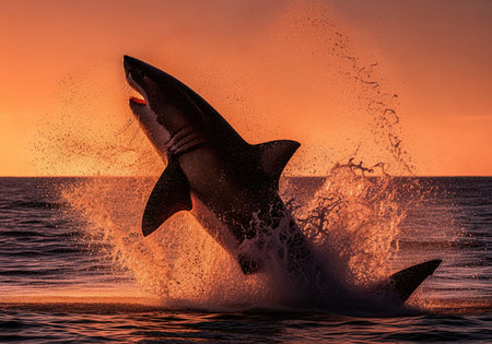 Great white shark exploding vertically out of turbulent ocean surface, creating dramatic water splashes against a vibrant orange sunset sky. captures raw power of marine predator.