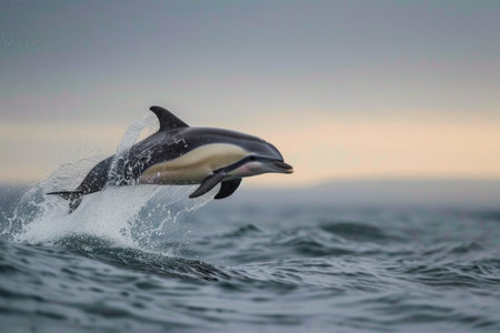 Dramatic wide shot of dolphin leaping from cresting wave during golden hour