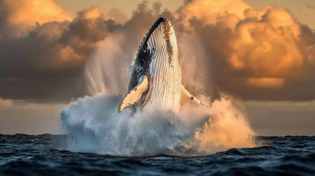 A stunning humpback whale breaches the surface of the ocean against a backdrop of a colorful sunset and dramatic clouds. This breathtaking moment captures the power and beauty of nature