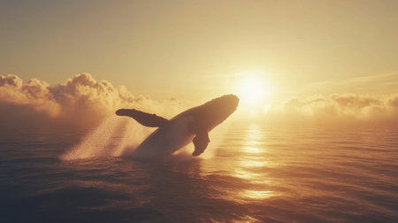 A breathtaking scene of a humpback whale breaching the water at sunrise, surrounded by tranquil ocean waters and soft clouds, capturing the beauty of nature.
