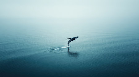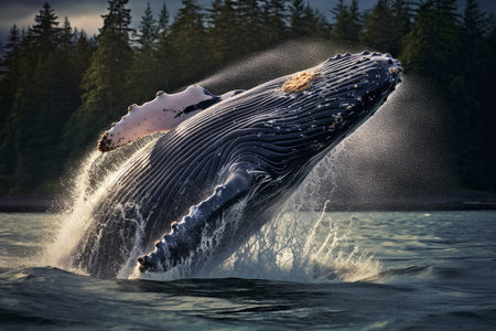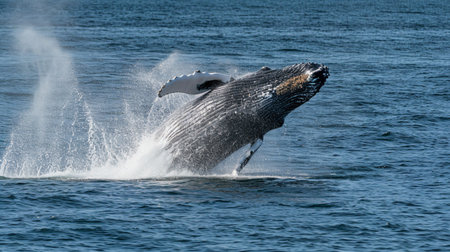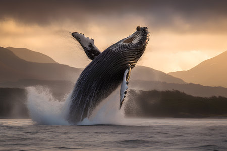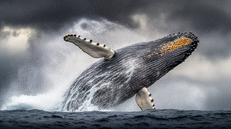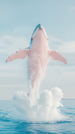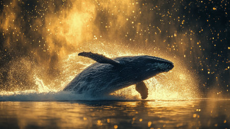 A breathtaking scene captures a whale breaching the ocean's surface, creating dynamic splashes and reflecting the beauty of marine life in nature's environment.