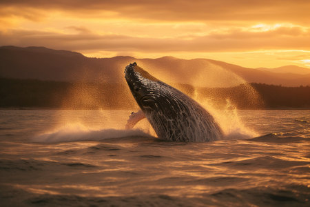 A humpback whale leaps out of the ocean at sunset, creating a magnificent splash as sunlight reflects off the water droplets, capturing a moment of natural beauty.