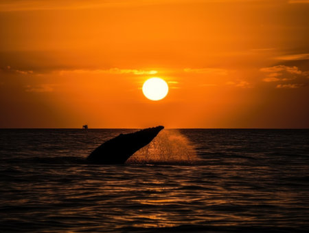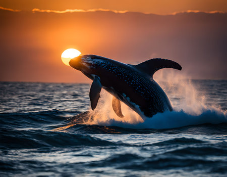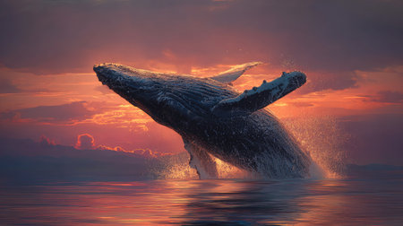 A humpback whale leaps from the water, silhouetted against a dramatic sunset. The image features orange and purple hues reflecting on the ocean surface. It exhibits a digital painting style, with soft lighting and a focus on the subject's form. Suitable for commercial and editorial purposes related to marine life and conservation.
