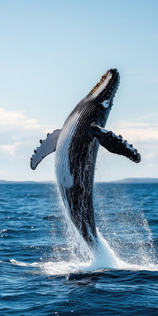 A breathtaking moment captures a humpback whale breaching the surface of the ocean, sending water splashing around it. The dynamic scene showcases the raw beauty and energy of marine wildlife against a backdrop of blue skies and dramatic clouds.