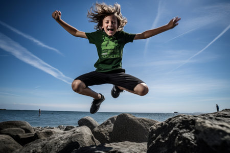 Vibrant Boy Leaping off Black Seashore Rock in Stylish Green Crew-neck Shirt