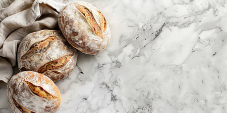 A loaf of freshly baked bread placed on a marble counter in a bright and modern kitchen, ready to be served. High quality photo