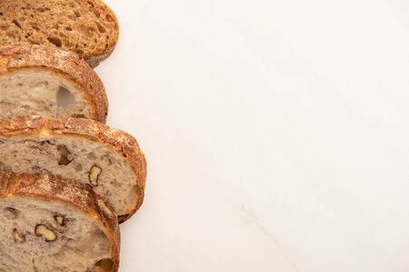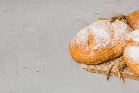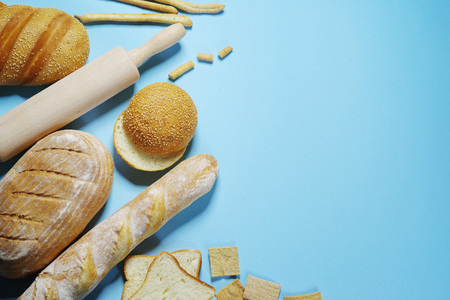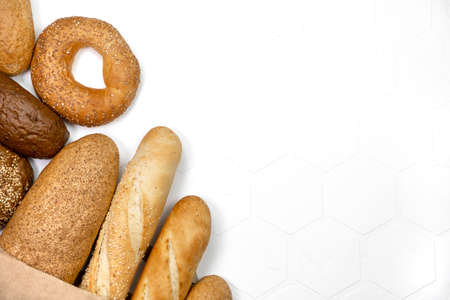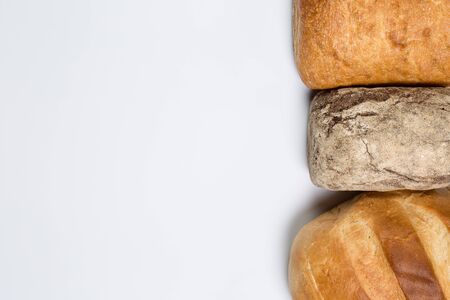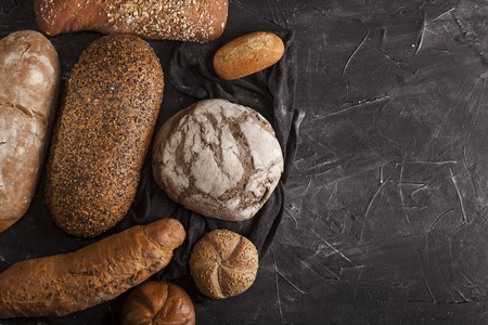 Homemade natural breads. Different kinds of fresh bread as background, top view with copy space.