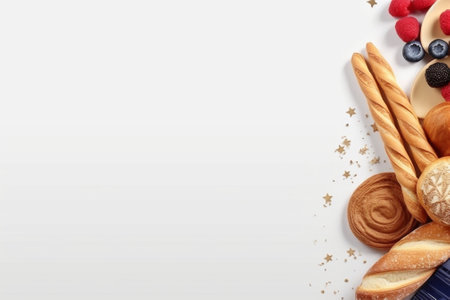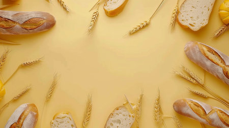 Freshly sliced baguette and French buns surrounded by wheat ears on a soft beige background