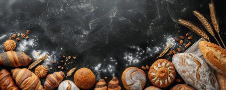 Assortment of freshly baked bakery products on blackboard with copy space, top view