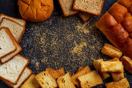 Bakery product, crispy and dry khari or puff,rusk and bun with copy (tex) space over dark background