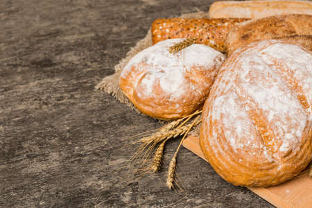 Homemade natural breads. Different kinds of fresh bread as background, perspective view with copy space.