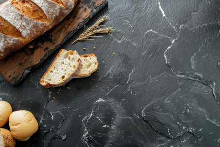 A fresh bread on the kitchen dark stone table, slightly sliced, flat lay with a place for text. AI generated