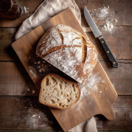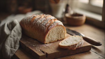 A beautiful display of freshly baked artisan bread, sliced on a rustic wooden cutting board with a knife, perfect for culinary photography and food styling.