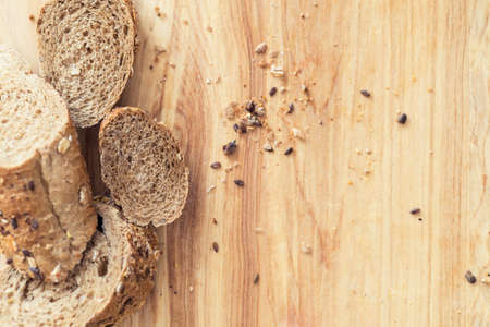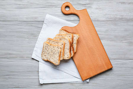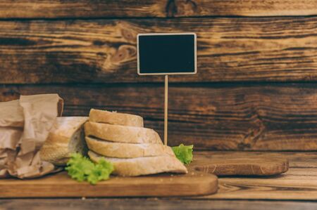 Top view sliced bread in cutting board on wooden table and gray background. horizontal