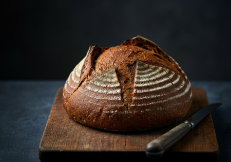 Artisan round sourdough bread on wooden cutting board with knife in dark rustic setting.