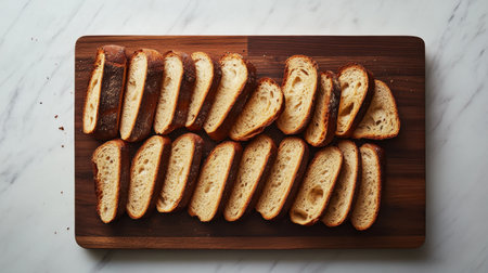 A beautiful arrangement of freshly sliced artisan bread on a wooden platter, perfect for culinary presentation and food photography in kitchens or restaurants.