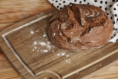 Freshly baked wheat bread on wooden cutting board. Still life with home made rustic bread.
