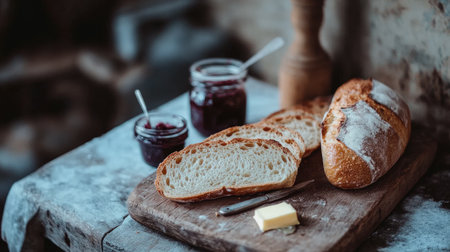 Indulge in the inviting scene of freshly baked bread on a rustic wooden table, perfectly paired with creamy butter and sweet jam for a cozy meal.